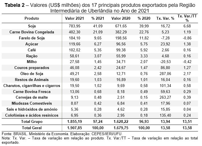 Em 2021, Uberlândia (US$ 802,07 milhões), Araguari (US$ 700,94 milhões) e Ituiutaba (US$ 238,10 milhões), nessa ordem, foram os maiores exportadores da Região, sendo que Uberlândia também foi o município que mais impactou no aumento das receitas das exportações nesse período, com taxa de variação sobre o total de 8,40%.