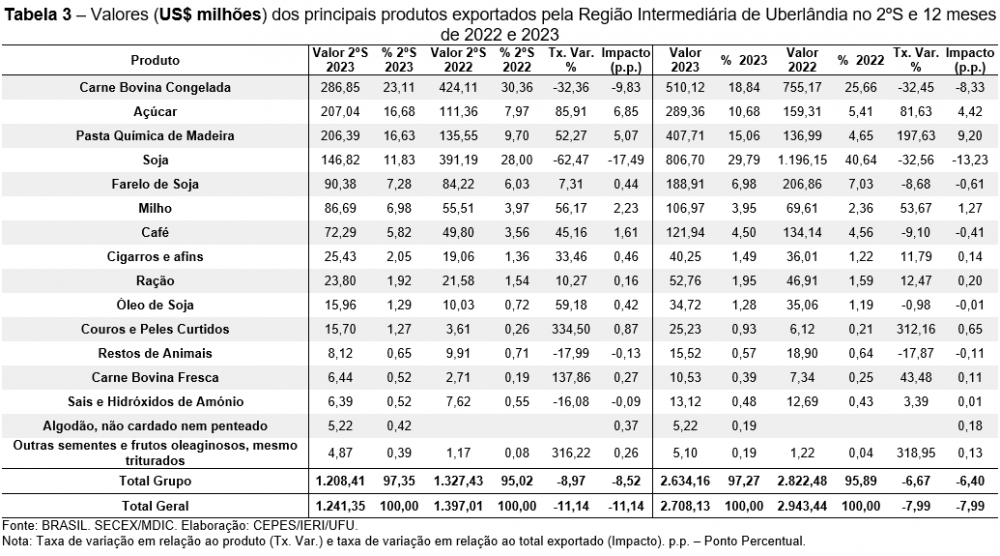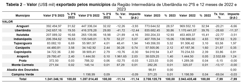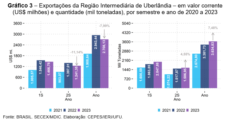 No Boletim de Comércio Exterior da Região Intermediária de Uberlândia (RGInt), do 2º semestre de 2023 (2ºS de 2023), é visto que as exportações da Região, no valor total de US$ 1,24 bilhão, foram 11,14% inferiores às exportações de 2022, para o mesmo semestre, ao contrário das quantidades exportadas (1,59 milhão de tonelada), que foram 4,55% superiores às exportadas no segundo semestre de 2022.