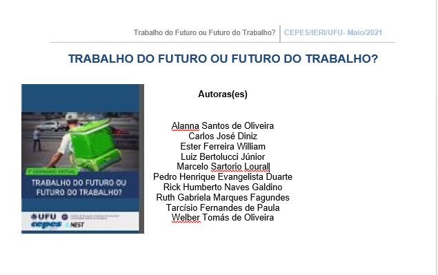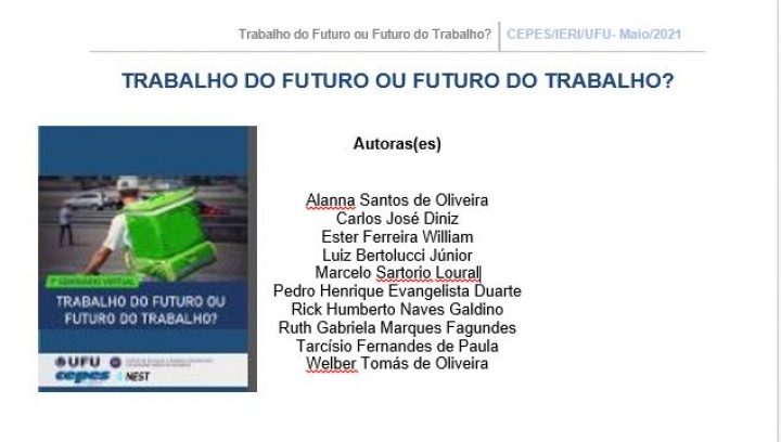 Neste seminário que está diponível no canal do IERI UFU no YouTube (clique para ver), foi lançada uma publicação especial pelo CEPES, com apoio do NEST, também denominada de "Trabalho do Futuro ou Futuro do Trabalho?"