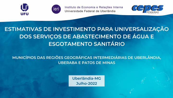 O trabalho “Estimativas de investimento para universalização dos serviços de abastecimento de água e esgotamento sanitário nos municípios das RGInt de Uberlândia, Uberaba e Patos de Minas”, do Centro de Estudos, Pesquisas e Projetos Econômico-sociais (CEPES-UFU), estimou que serão necessários R$ 3.415.637.019 (três bilhões, quatrocentos e quinze milhões, seiscentos e trinta e sete mil e dezenove reais) em investimentos para que todos os municípios das regiões geográficas intermediárias (RGInt) de Uberlândia, Uberaba e Patos de Minas alcancem as metas.