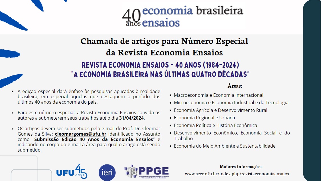 Para este número especial, a Revista Economia Ensaios convida os autores a submeterem seus trabalhos até o dia 31/04/2024.