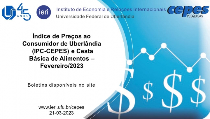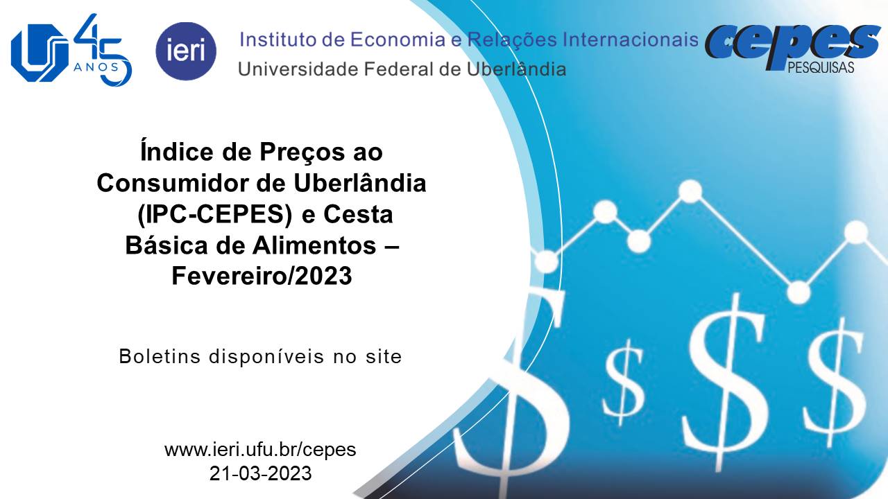 O Índice de Preços ao Consumidor de Uberlândia (IPC-CEPES), em fevereiro de 2023, apresentou variação de 0,31%, ficando 0,62 ponto percentual (p.p.) abaixo da taxa registrada de janeiro de 2023 (0,93%). No ano de 2023, a variação acumulada do IPC-CEPES foi 1,24%.