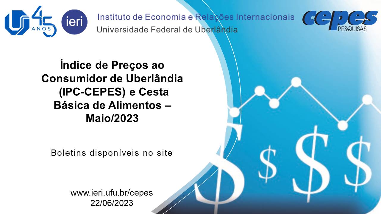 O Índice de Preços ao Consumidor de Uberlândia (IPC-CEPES), em maio de 2023, apresentou variação de -0,20%, ficando 0,65 ponto percentual (p.p.) abaixo da taxa registrada em abril de 2023 (0,45%). No ano de 2023, a variação acumulada do IPC-CEPES foi 2,23%.
