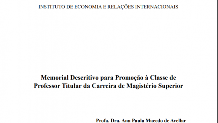 O Instituto de Economia e Relações Internacionais da Universidade Federal de Uberlândia torna público e convida todos para a Defesa Pública de Memorial Visando a Promoção na Carreira de Magistério Superior de Professor Associado IV-DE para Professor Titular-DE da Profa. Ana Paula Macedo de Avellar, a ser avaliada pela Comissão Especial de Avaliação composta pelos Professores João Carlos Ferraz (IE/UFRJ -Presidente), Eduardo da Motta e Albuquerque (CEDEPLAR/FACE - UFMG) e Ana Urraca-Ruiz (IE/UFF). A Defesa Pública se realizará no dia 10 de julho de 2023, às 14h00, no Instituto de Economia e Relações Internacionais, Bloco J - Sala 244 "Roberto Cury Sampaio” do Campus Santa Mônica da UFU.
