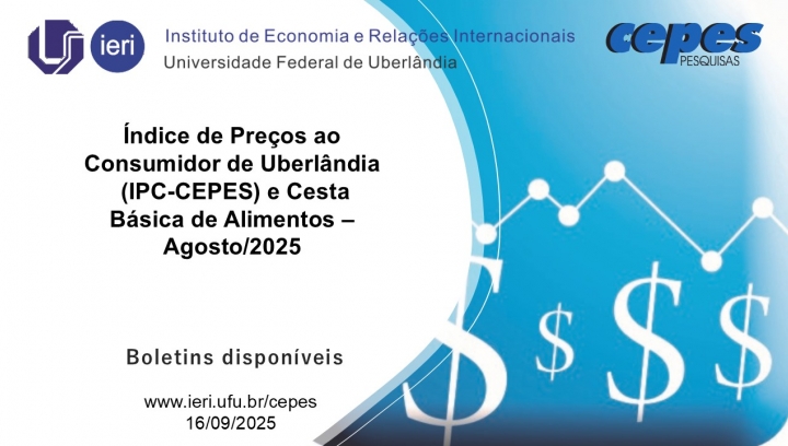 O Índice de Preços ao Consumidor de Uberlândia (IPC-CEPES), em agosto de 2025, apresentou uma variação de -0,15%, abaixo da taxa de julho (0,10%). No ano, a variação do IPC-CEPES acumula alta de 2,09% e, nos últimos doze meses, a variação acumulada ficou em 3,86%.